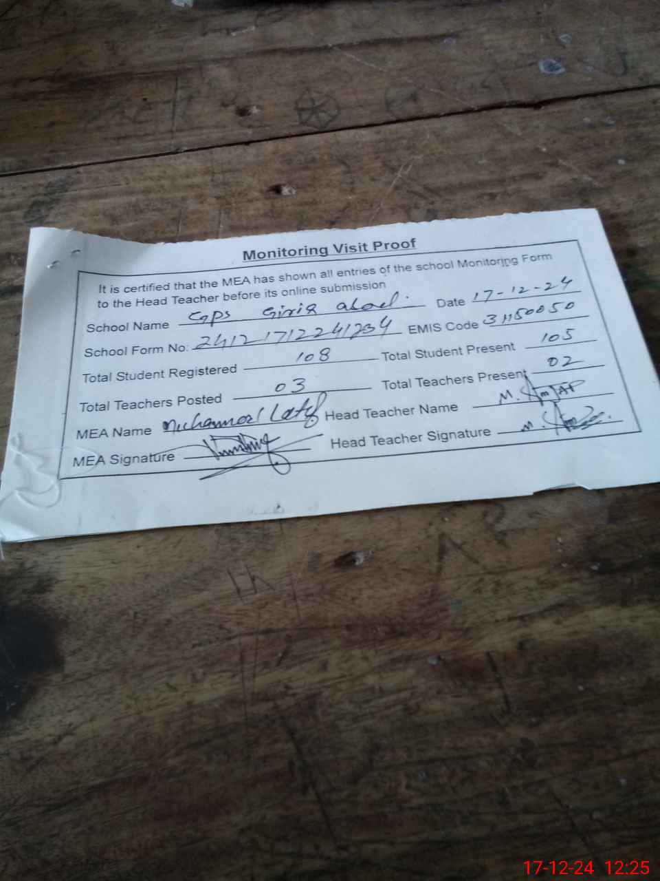 | Attendance Register | Head Teacher | MEA with School | Visit Proof |