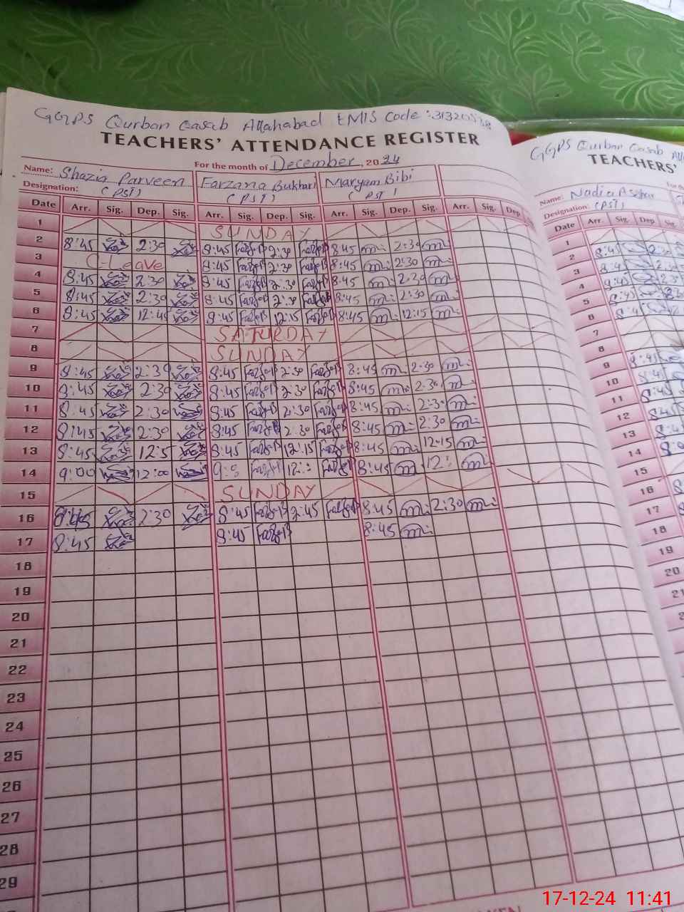 | CNIC | Full Name | Designation | R/C | Absence During Last Calender Month |