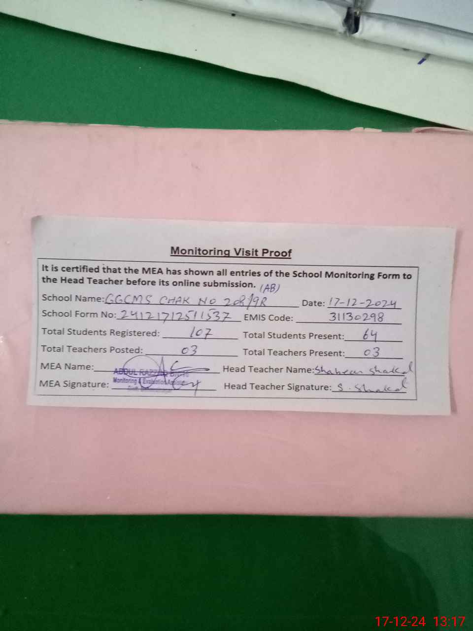 | EMIS Code: 31130298 | Name of School: GGCMS CHAK NO. 208/9-R AZAFI BASTI | |||