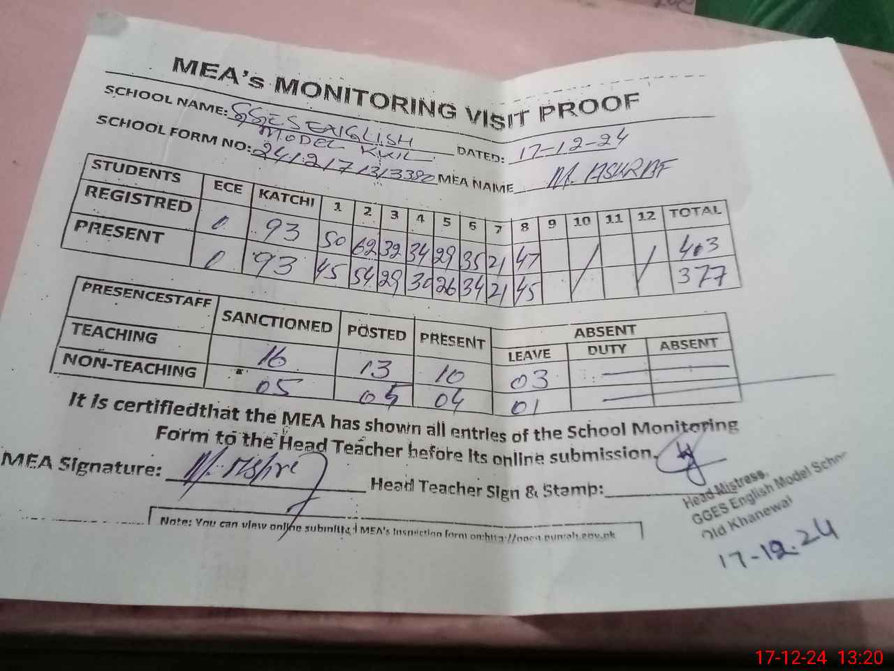 | Attendance Register | Head Teacher | MEA with School | Visit Proof |
