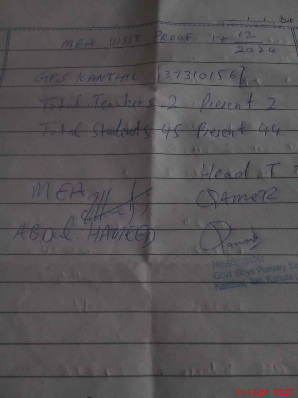 | Attendance Register | Head Teacher | MEA with School | Visit Proof |