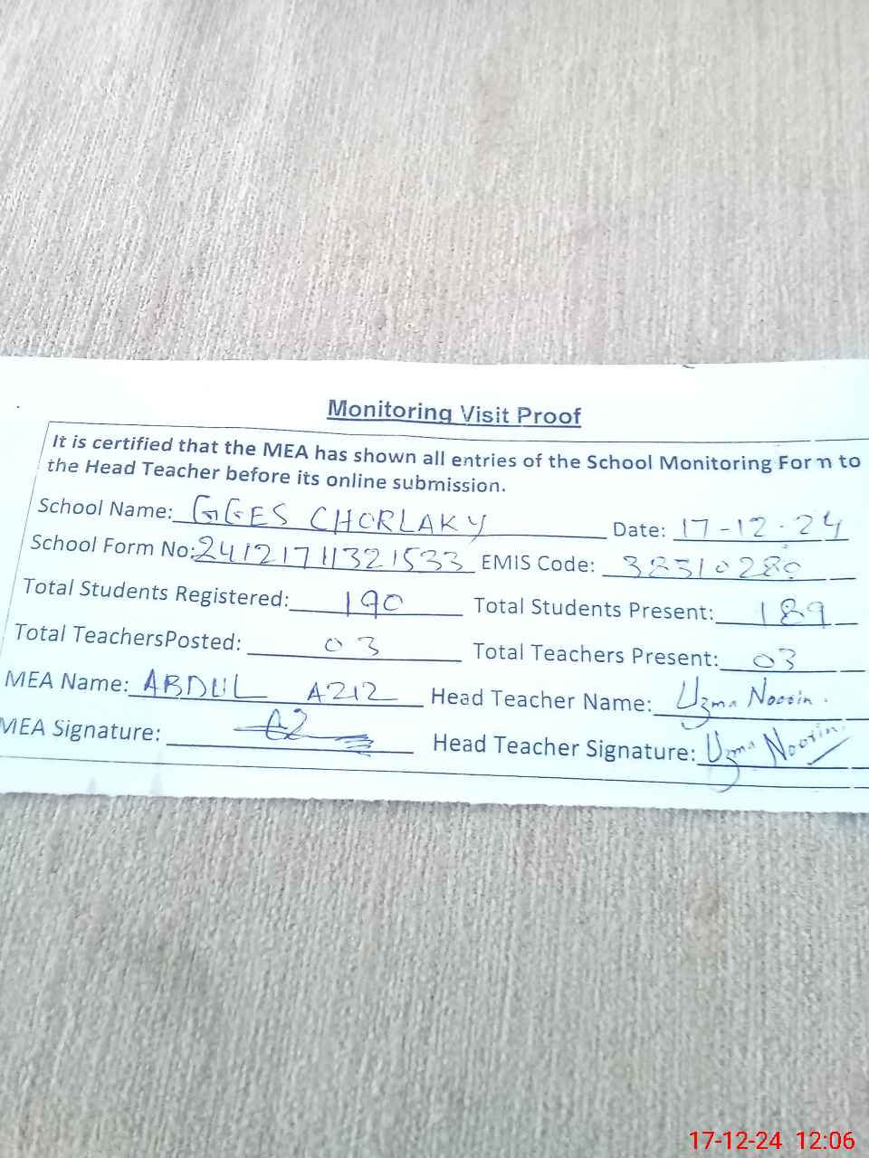 | Attendance Register | Head Teacher | MEA with School | Visit Proof |