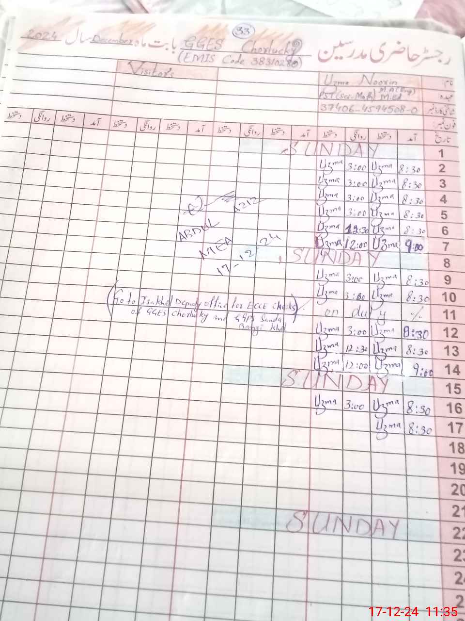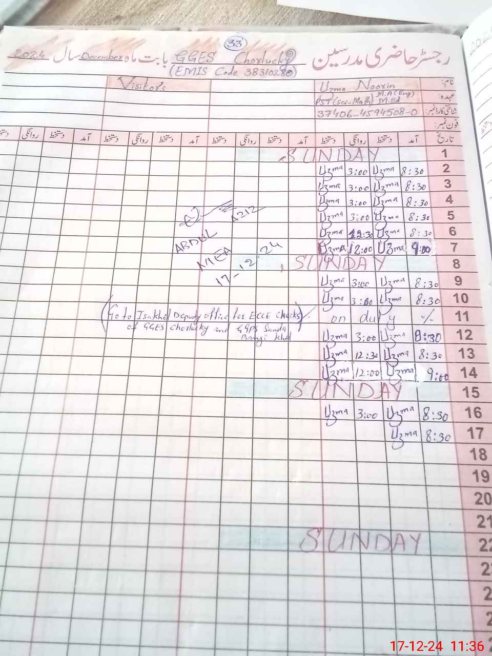 | Name: Uz**** No**** Designation: (School Headmaster's/Headmistress's) PST Phone/Cell Number: 03**** |