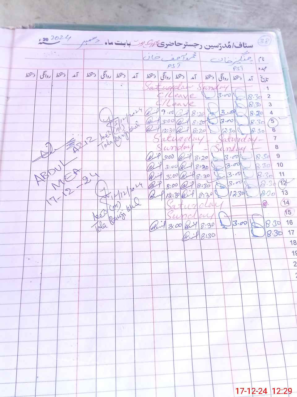 | CNIC | Full Name | Designation | R/C | Absence During Last Calender Month |