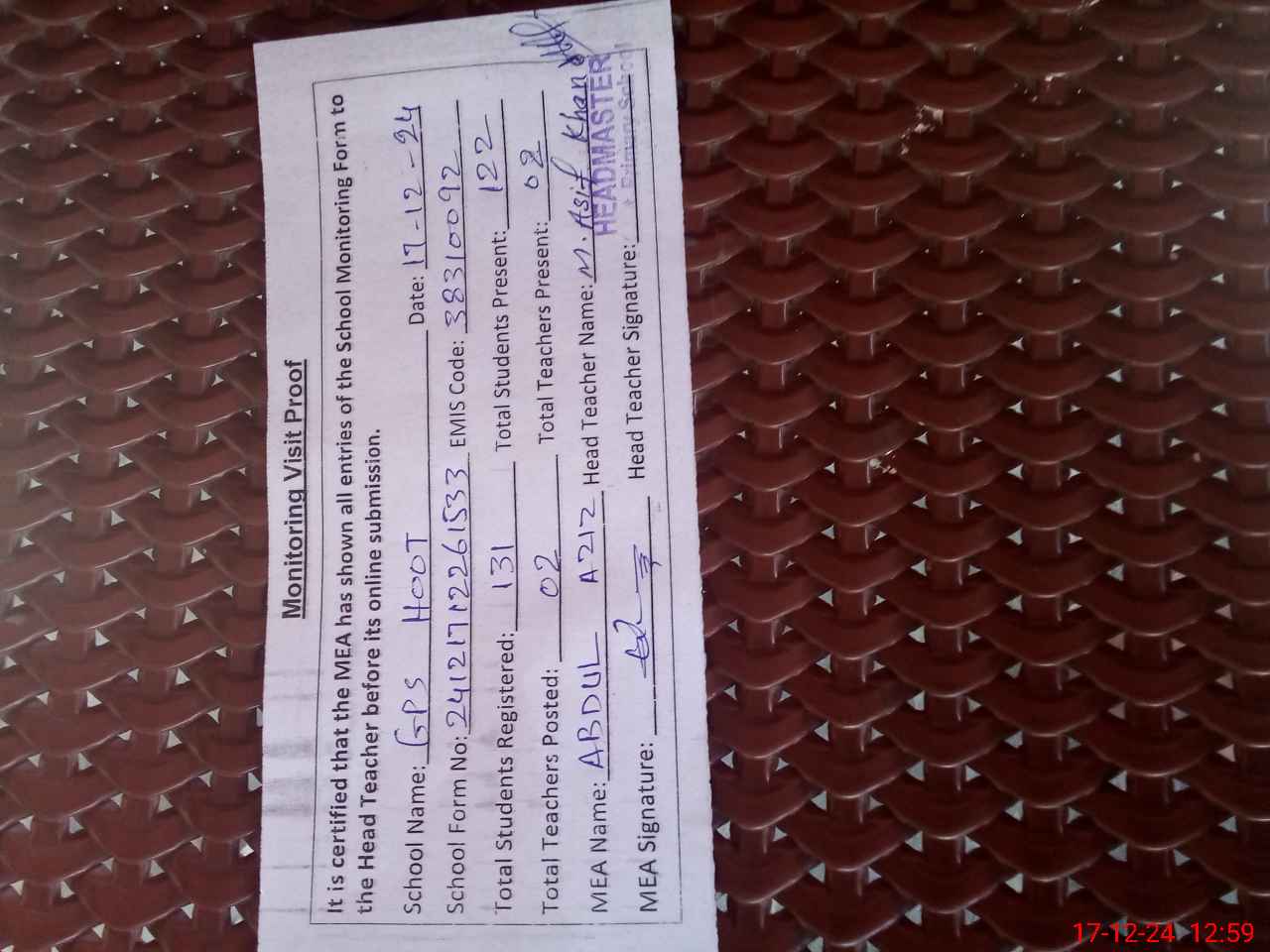 | Attendance Register | Head Teacher | MEA with School | Visit Proof |