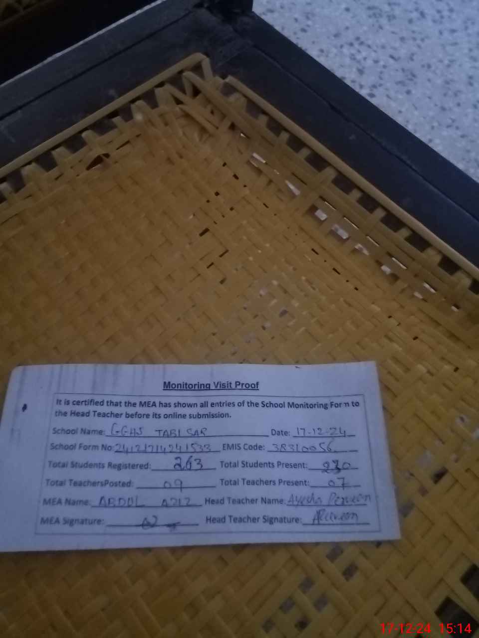 | Attendance Register | Head Teacher | MEA with School | Visit Proof |