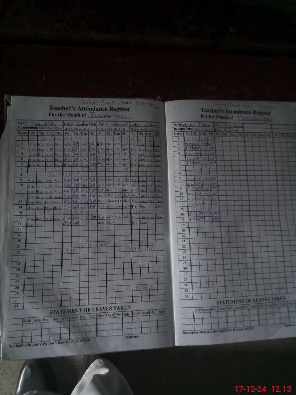 | CNIC | Full Name | Designation | R/C | Absence During Last Calender Month |