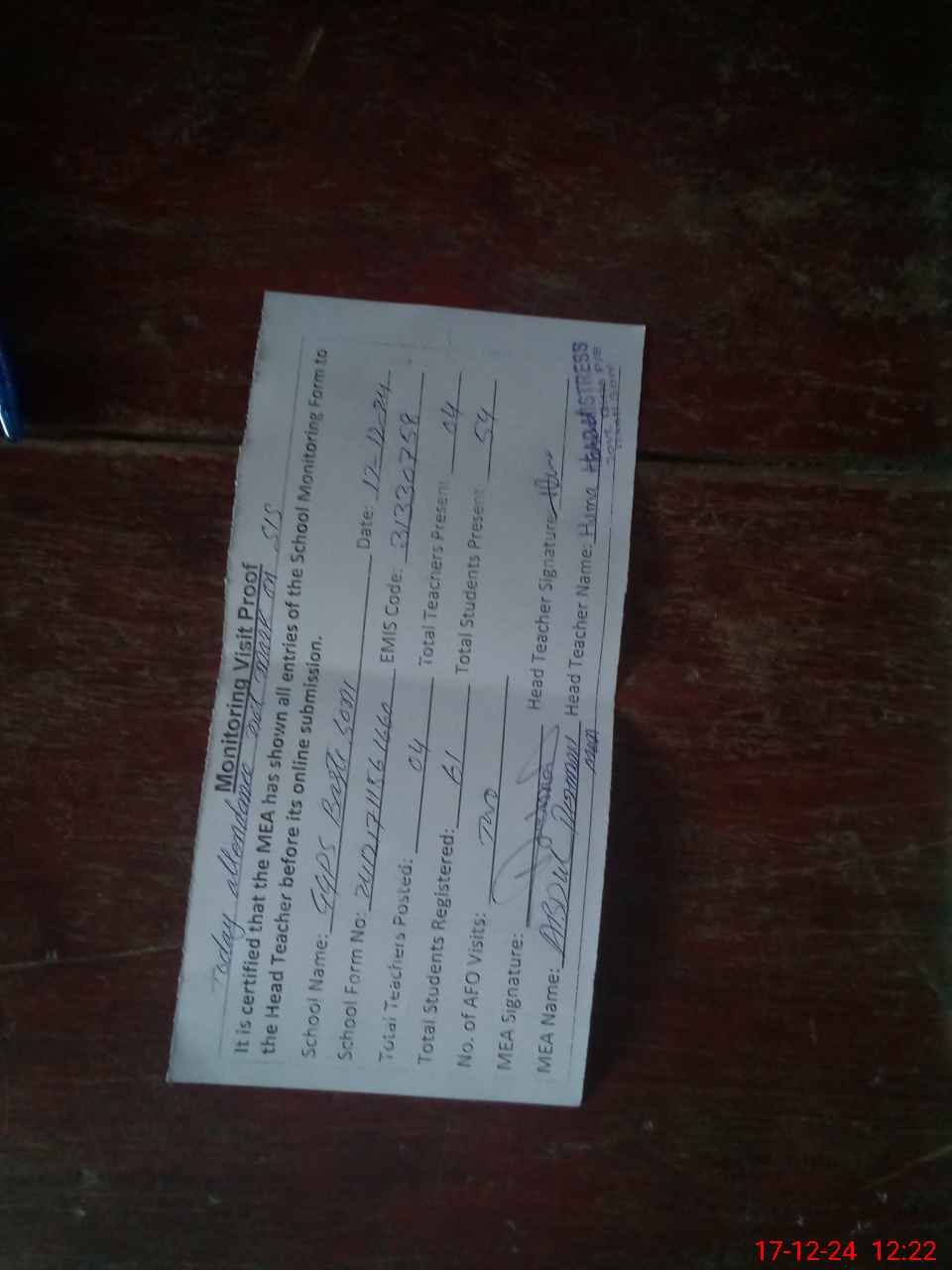 | Attendance Register | Head Teacher | MEA with School | Visit Proof |