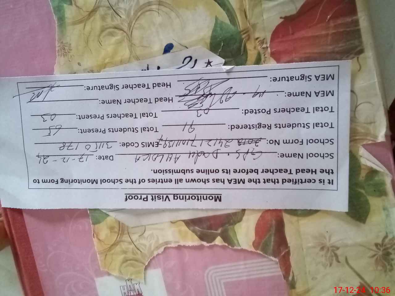 | Remarks (Use Separate Page if Required): AEO not visited the school last month and NSB RECORD NOT SHOWN TO MEA and free text books record not shown to mea and students attendance register are not updated | |||||