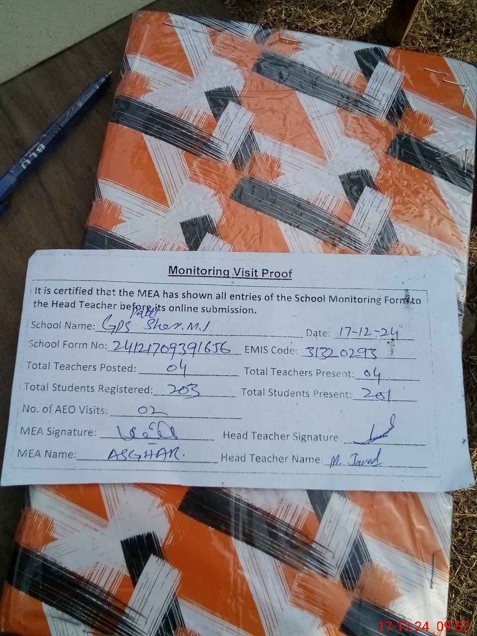 | Attendance Register | Head Teacher | MEA with School | Visit Proof |