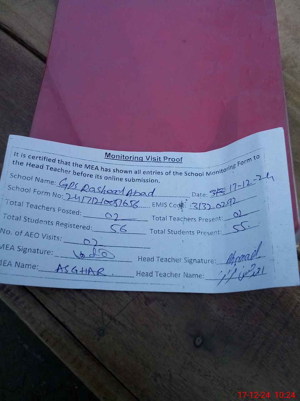 | Attendance Register | Head Teacher | MEA with School | Visit Proof |