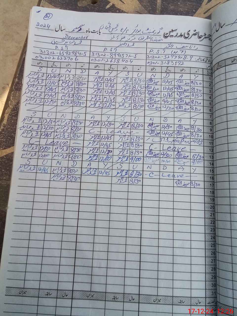 | CNIC | Full Name | Designation | R/C | Absence During Last Calender Month |