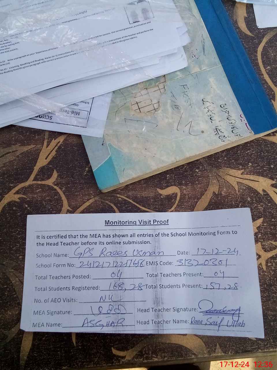 | Attendance Register | Head Teacher | MEA with School | Visit Proof |