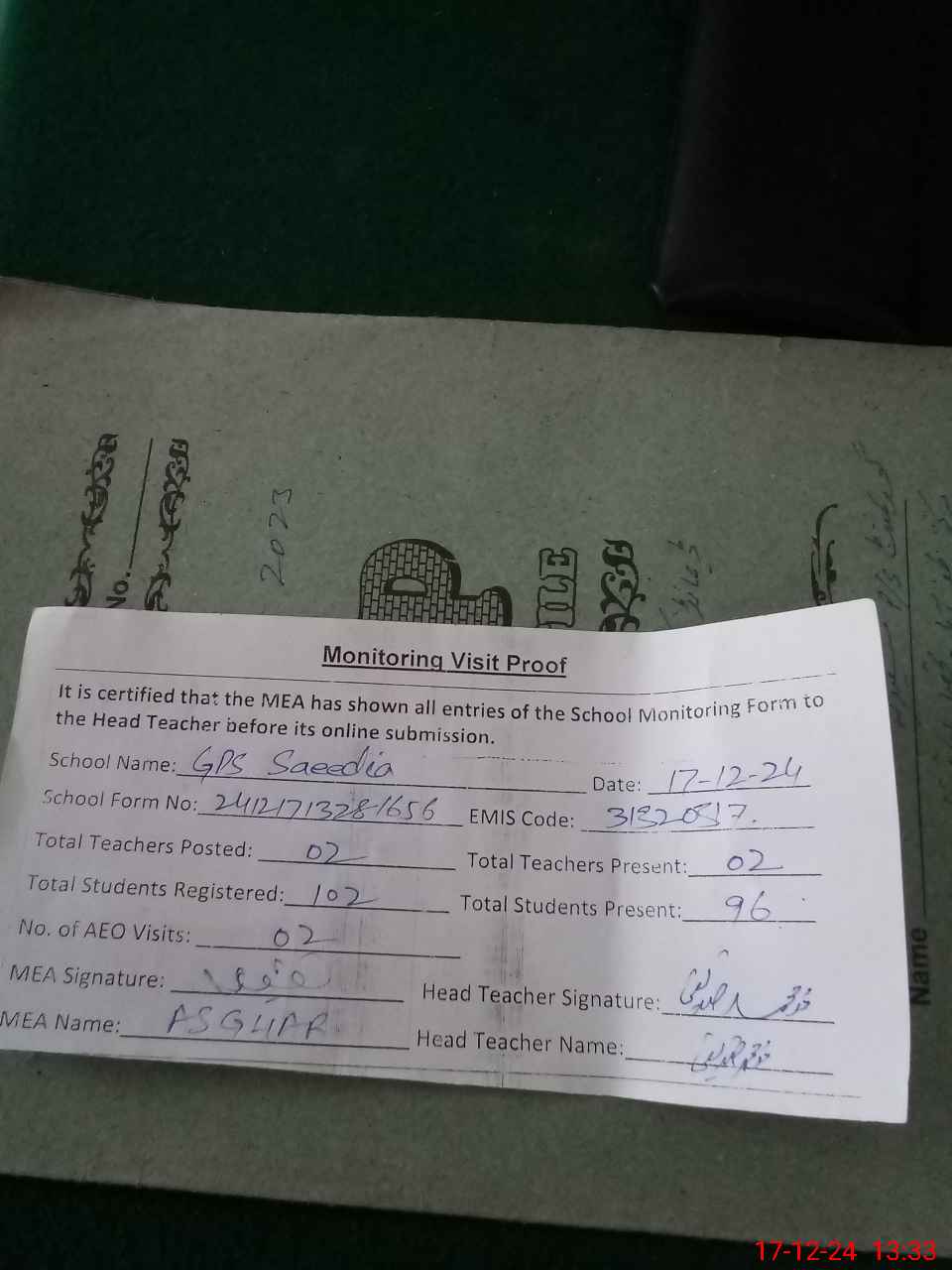 | Attendance Register | Head Teacher | MEA with School | Visit Proof |