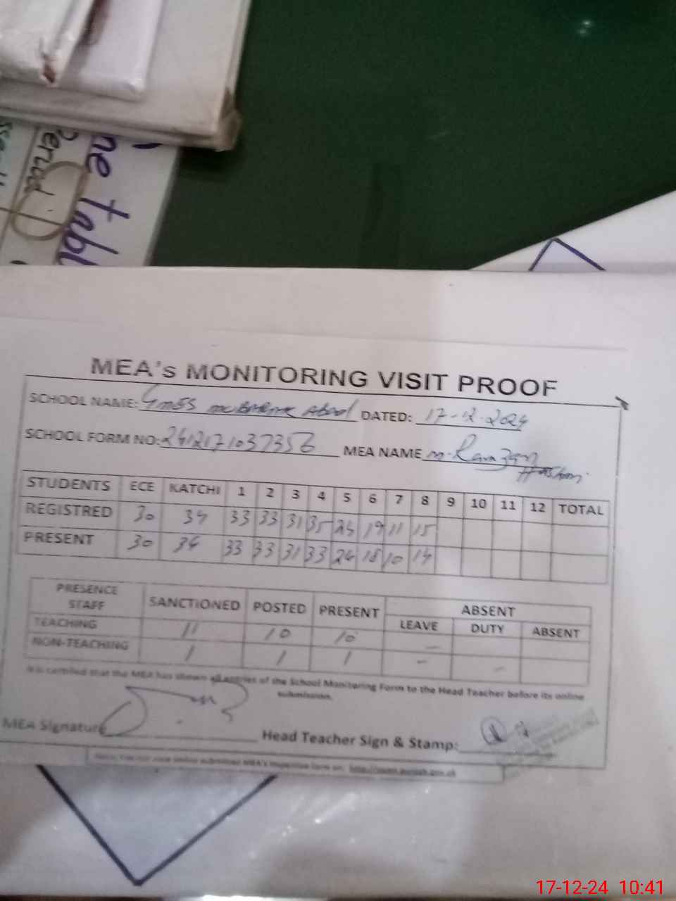 | Attendance Register | Head Teacher | MEA with School | Visit Proof |