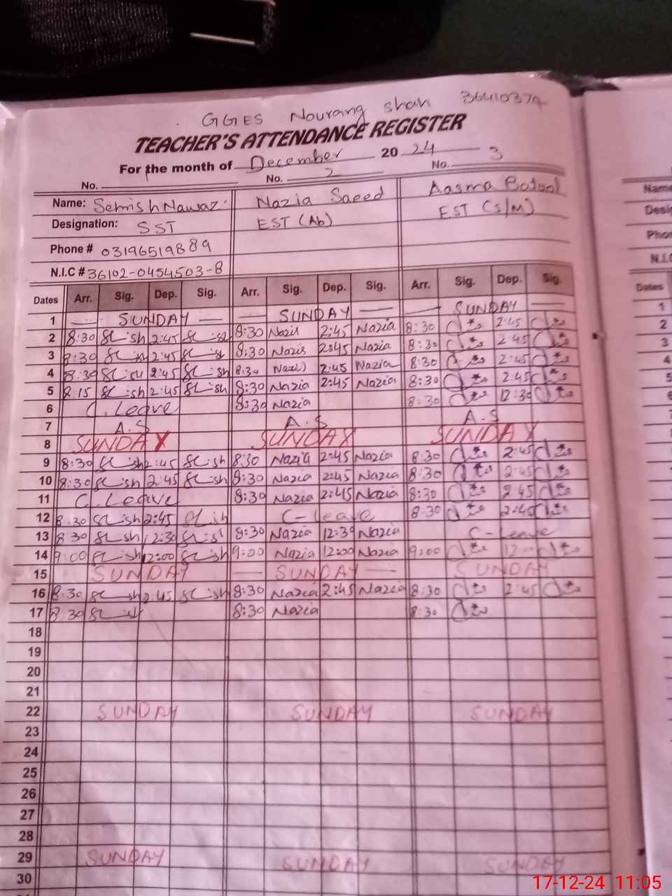 | CNIC | Full Name | Designation | R/C | Absence During Last Calender Month |