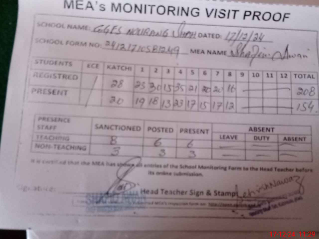 | Attendance Register | Head Teacher | MEA with School | Visit Proof |