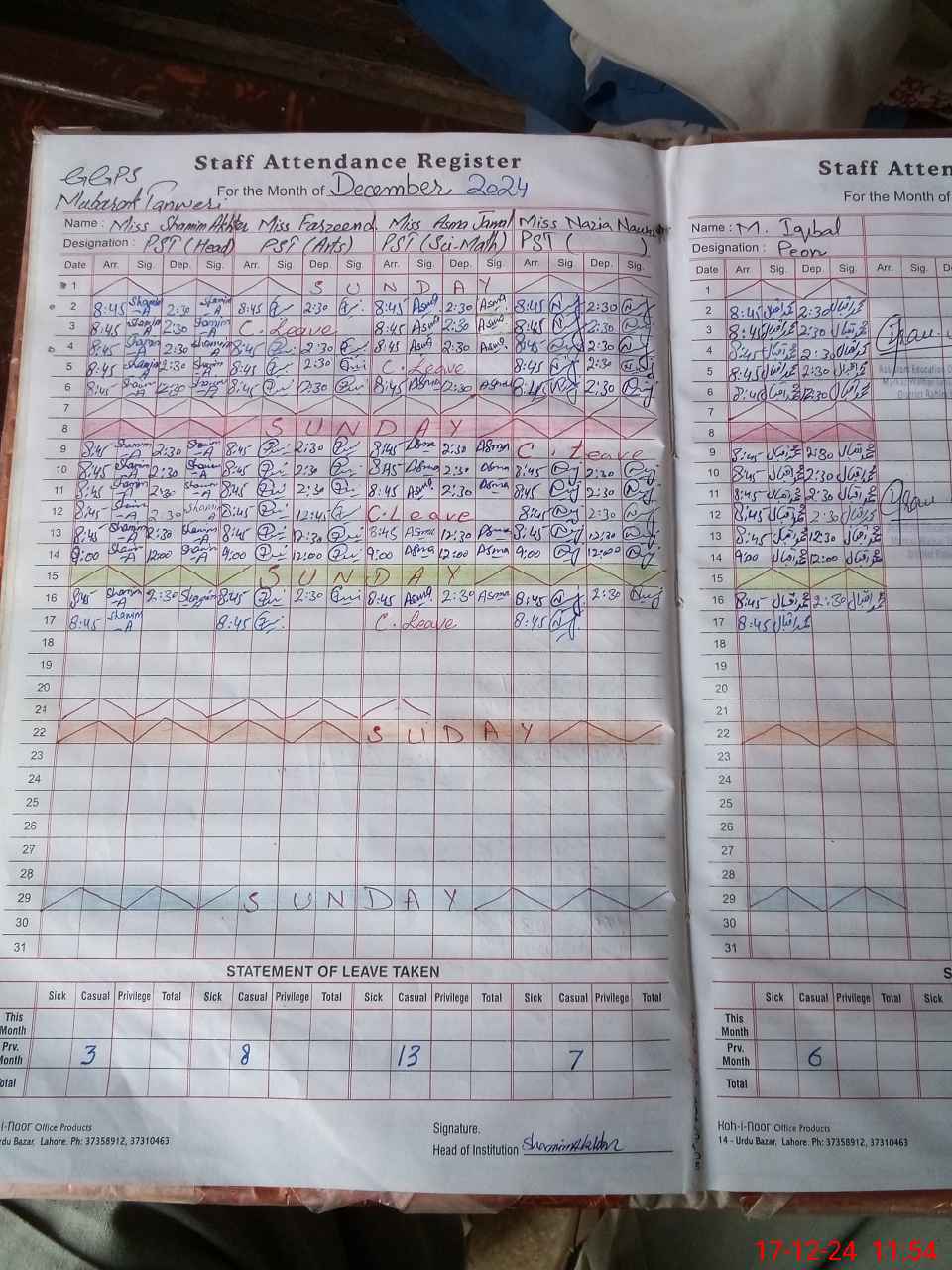 | CNIC | Full Name | Designation | R/C | Absence During Last Calender Month |