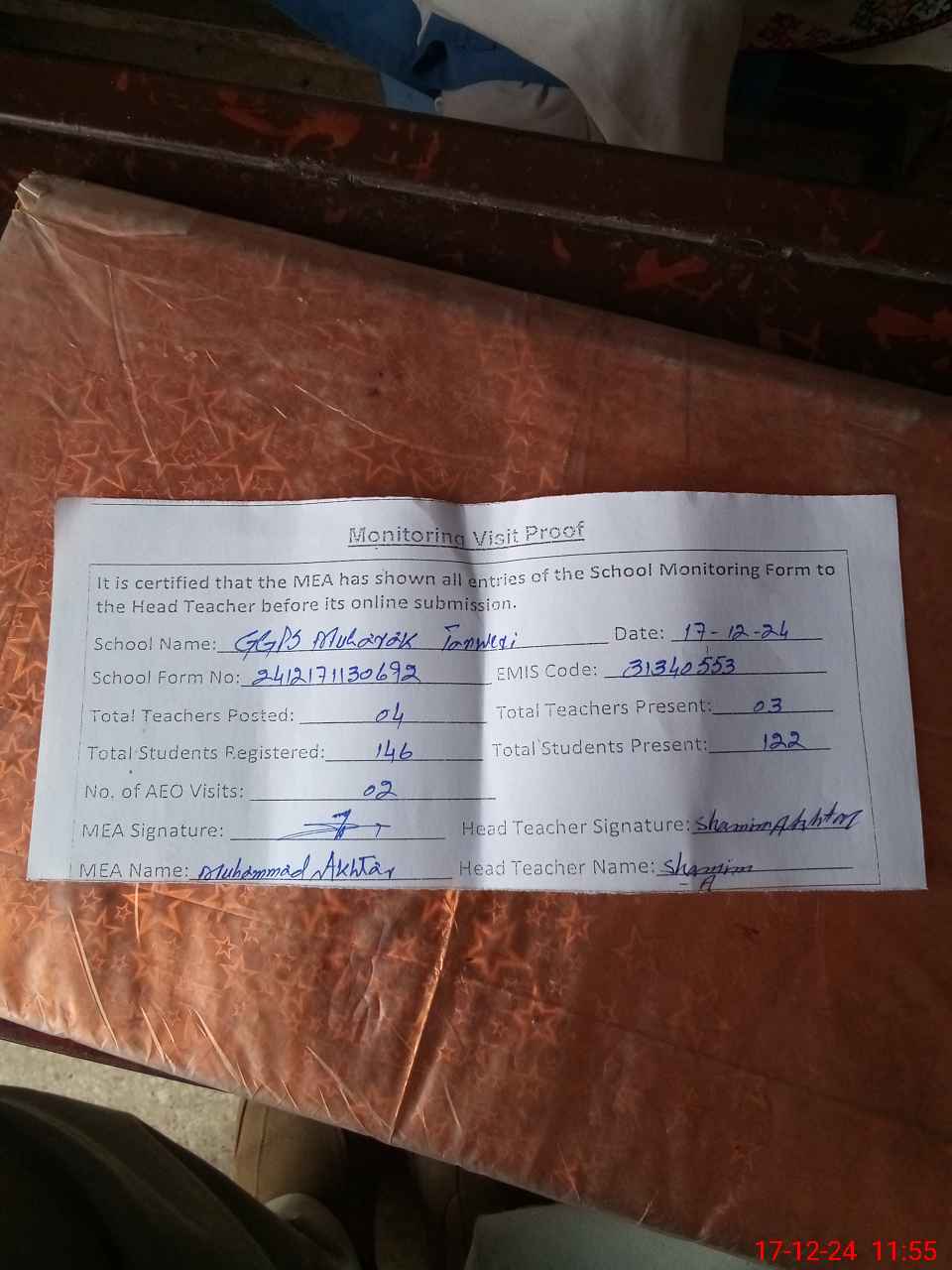 | Attendance Register | Head Teacher | MEA with School | Visit Proof |