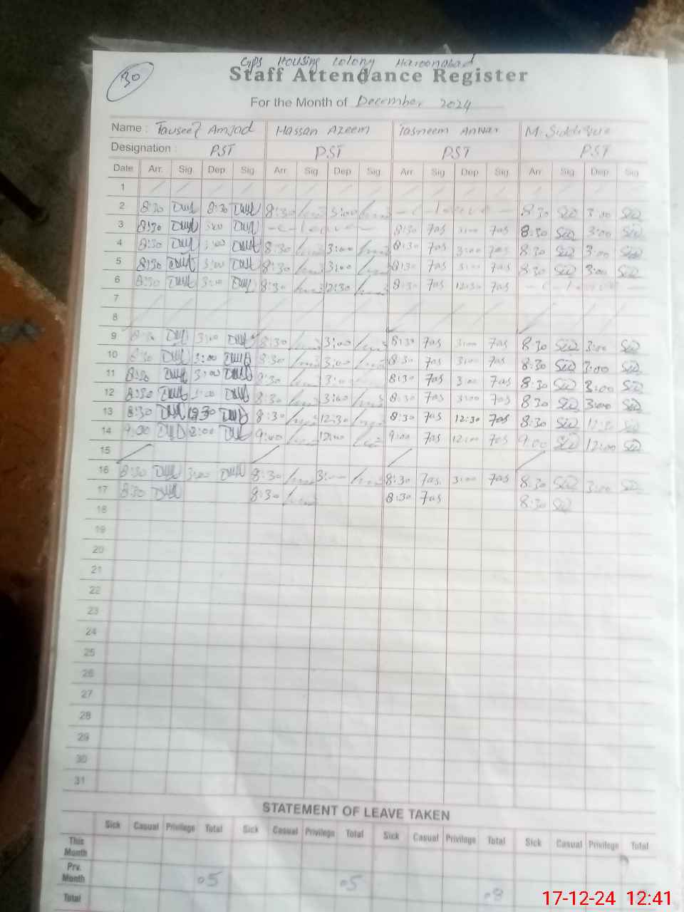 | CNIC | Full Name | Designation | R/C | Absence During Last Calender Month |