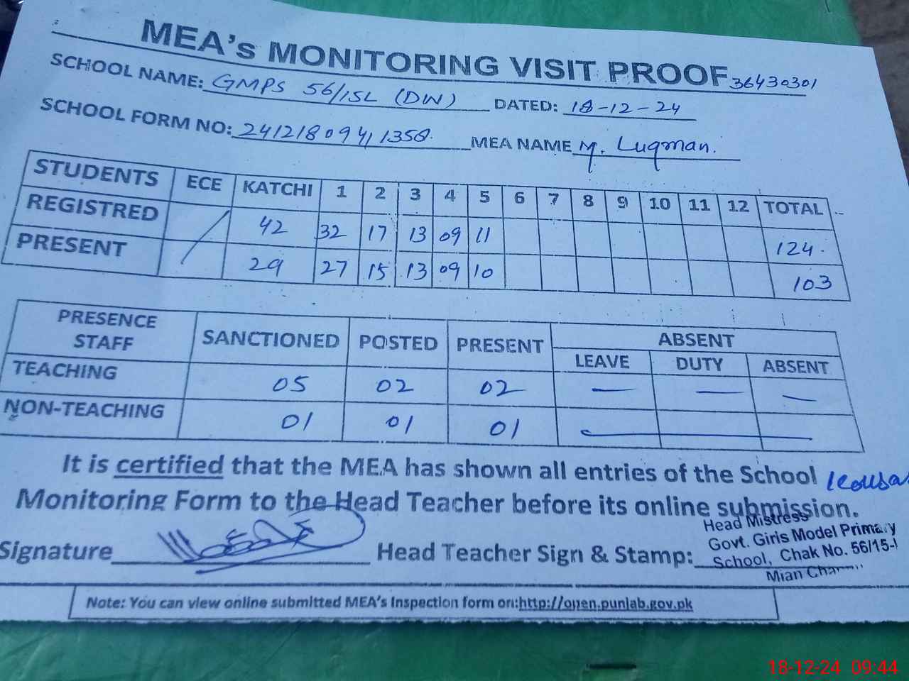 | EMIS Code: 36430301 | Name of School: GGPS 56/15-L, MIAN CHANNU | |||