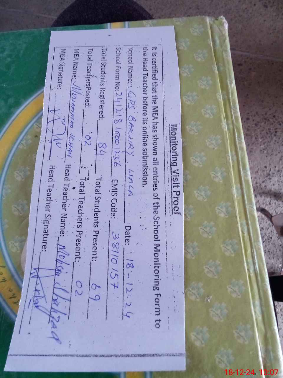 | Attendance Register | Head Teacher | MEA with School | Visit Proof |