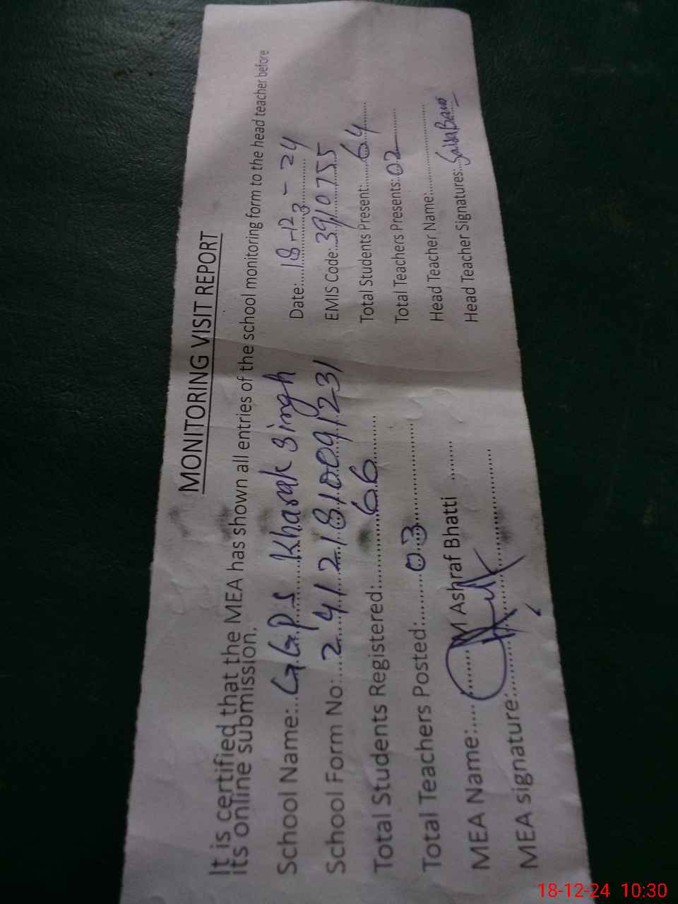 | Attendance Register | Head Teacher | MEA with School | Visit Proof |
