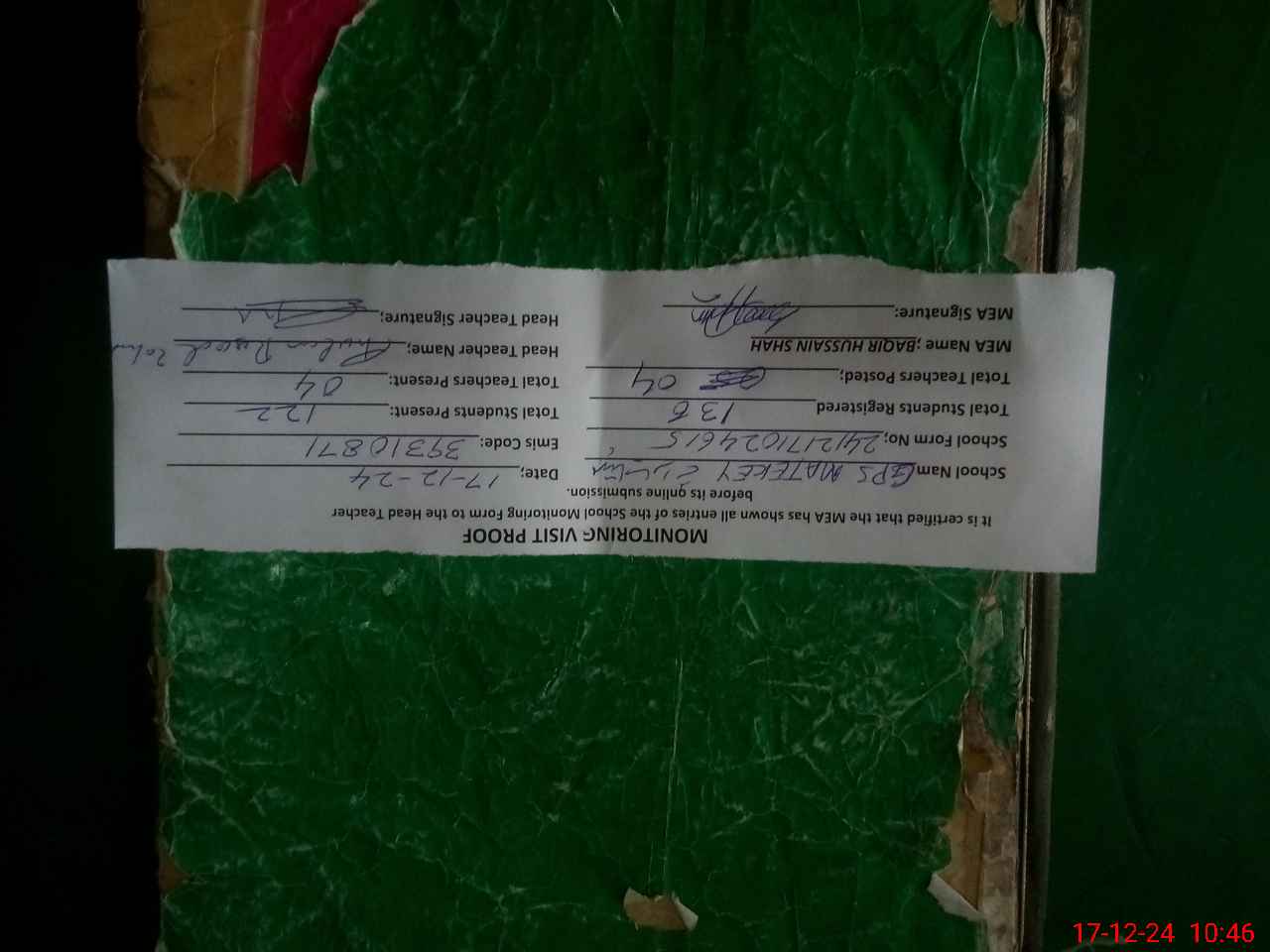 | Attendance Register | Head Teacher | MEA with School | Visit Proof |