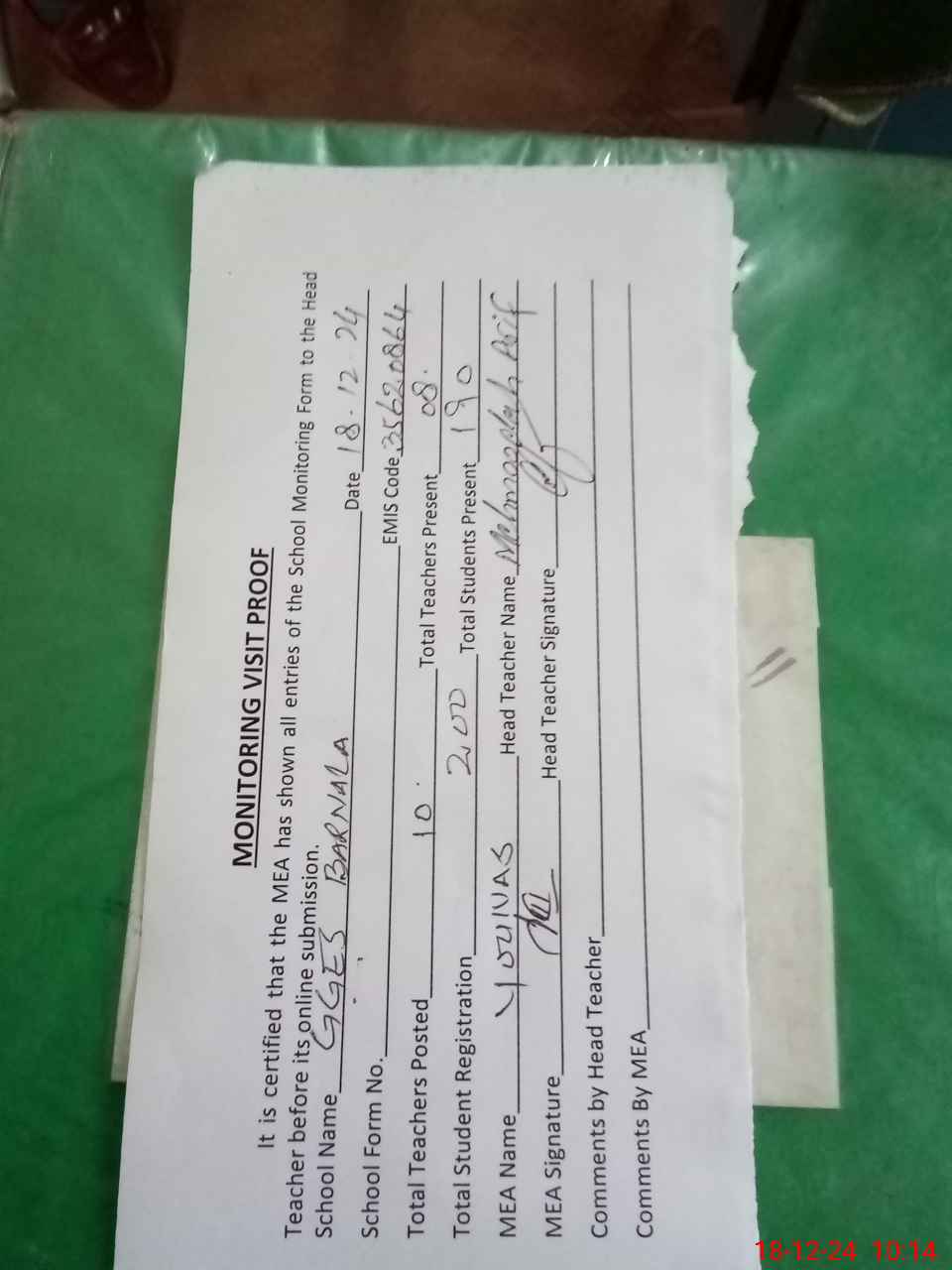 | Attendance Register | Head Teacher | MEA with School | Visit Proof |