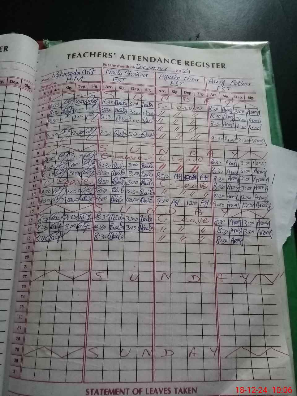 | Leave | Duty | Absent | Maternity | Medical | Ex- Pak |