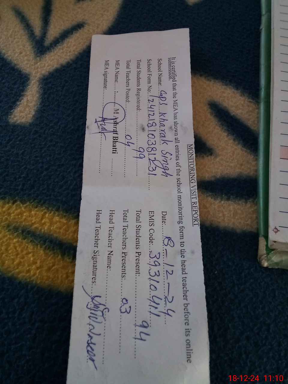 | Attendance Register | Head Teacher | MEA with School | Visit Proof |