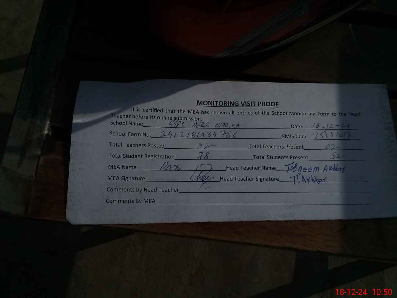 | Attendance Register | Head Teacher | MEA with School | Visit Proof |
