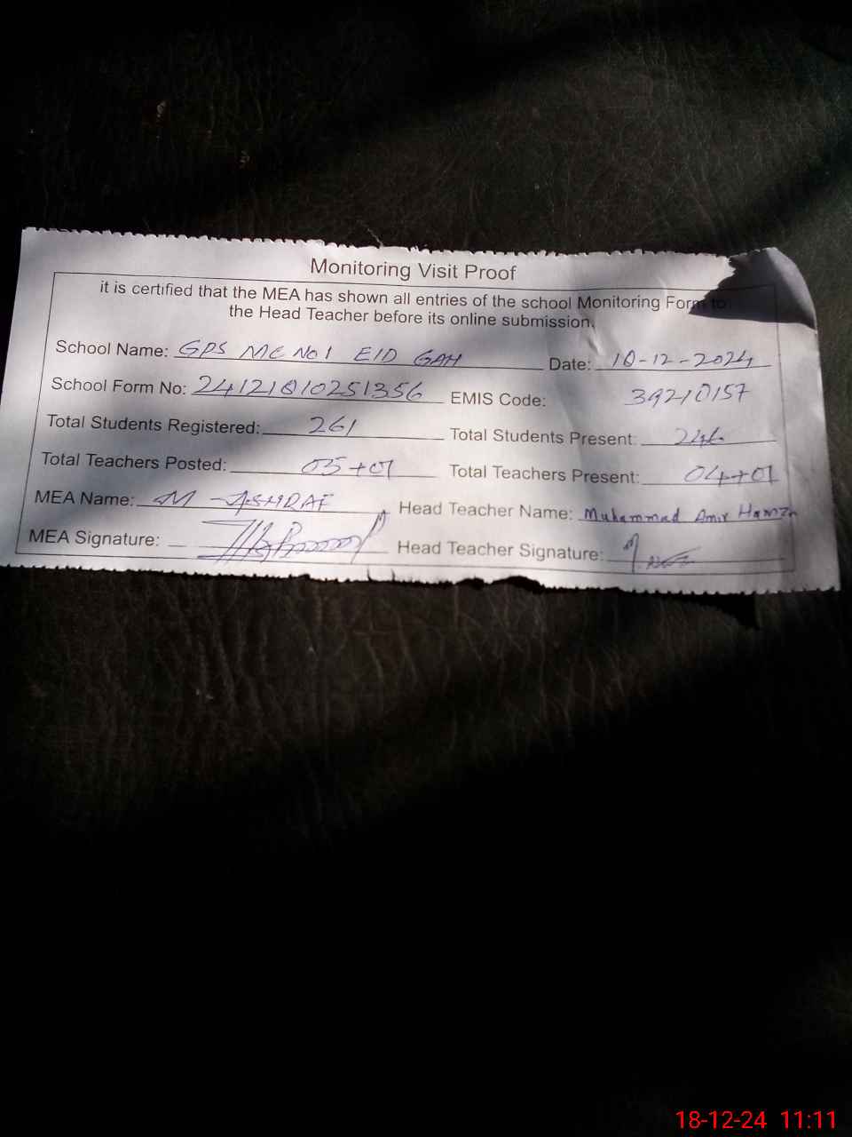 | Attendance Register | Head Teacher | MEA with School | Visit Proof |