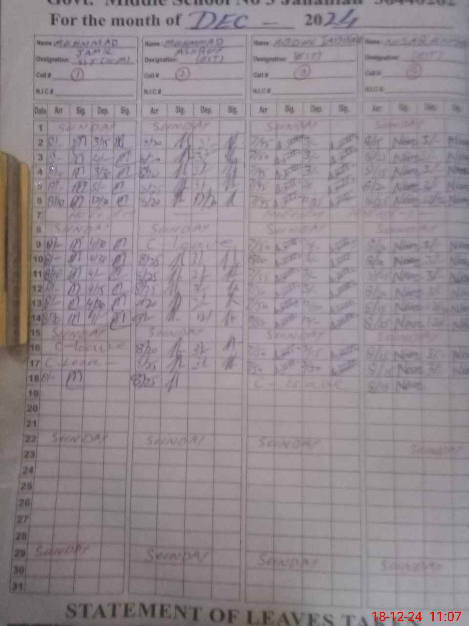 | CNIC | Full Name | Designation | R/C | Absence During Last Calender Month |