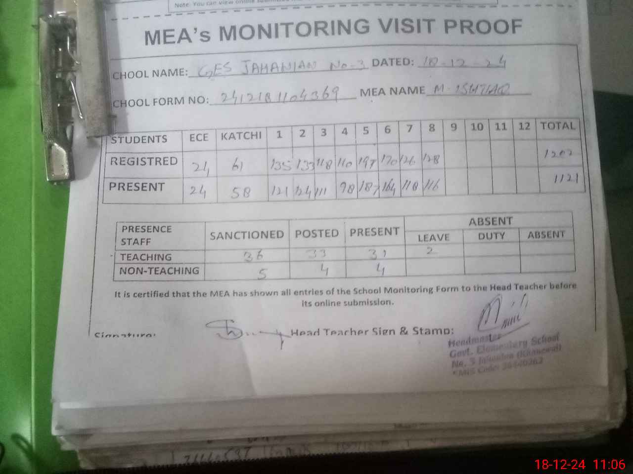 | Attendance Register | Head Teacher | MEA with School | Visit Proof |