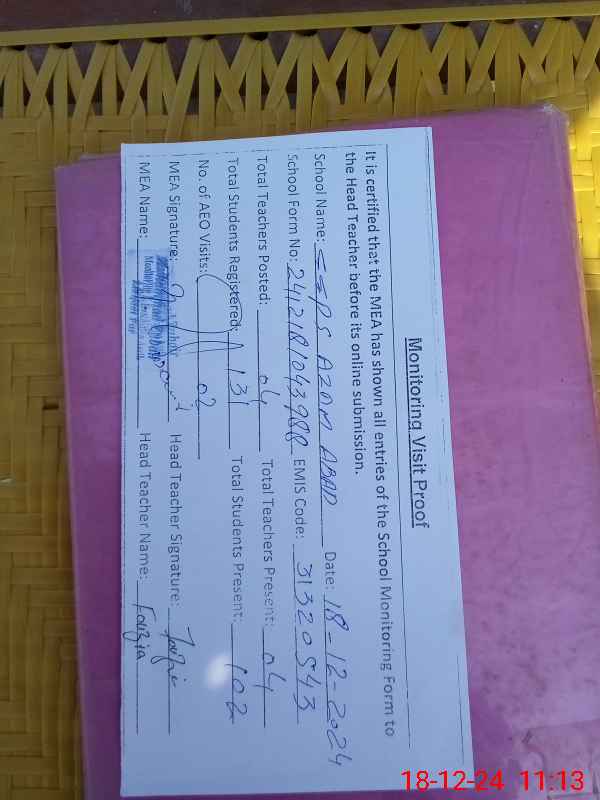 | Attendance Register | Head Teacher | MEA with School | Visit Proof |