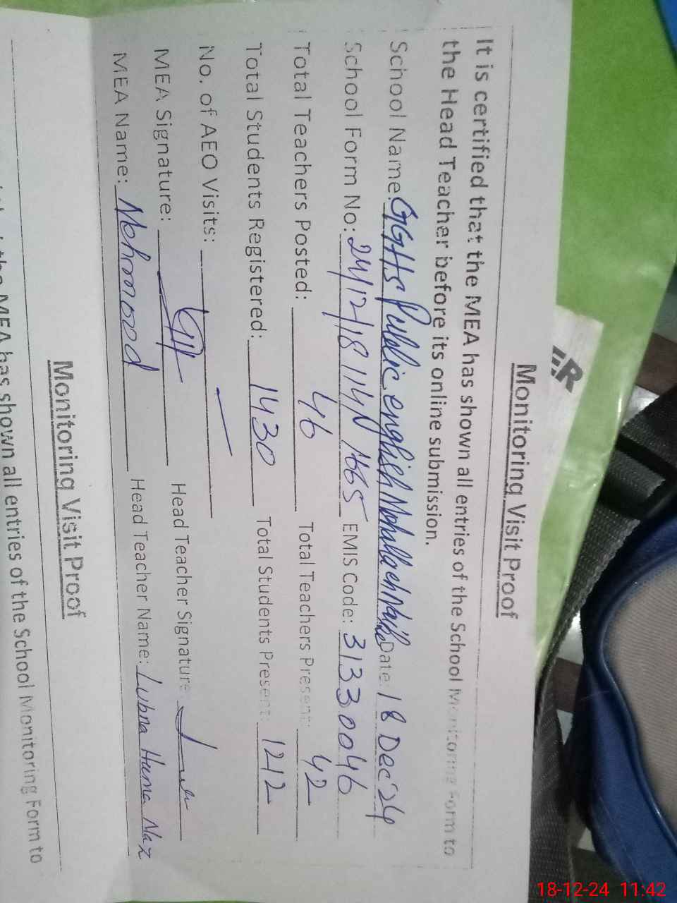 | Attendance Register | Head Teacher | MEA with School | Visit Proof |