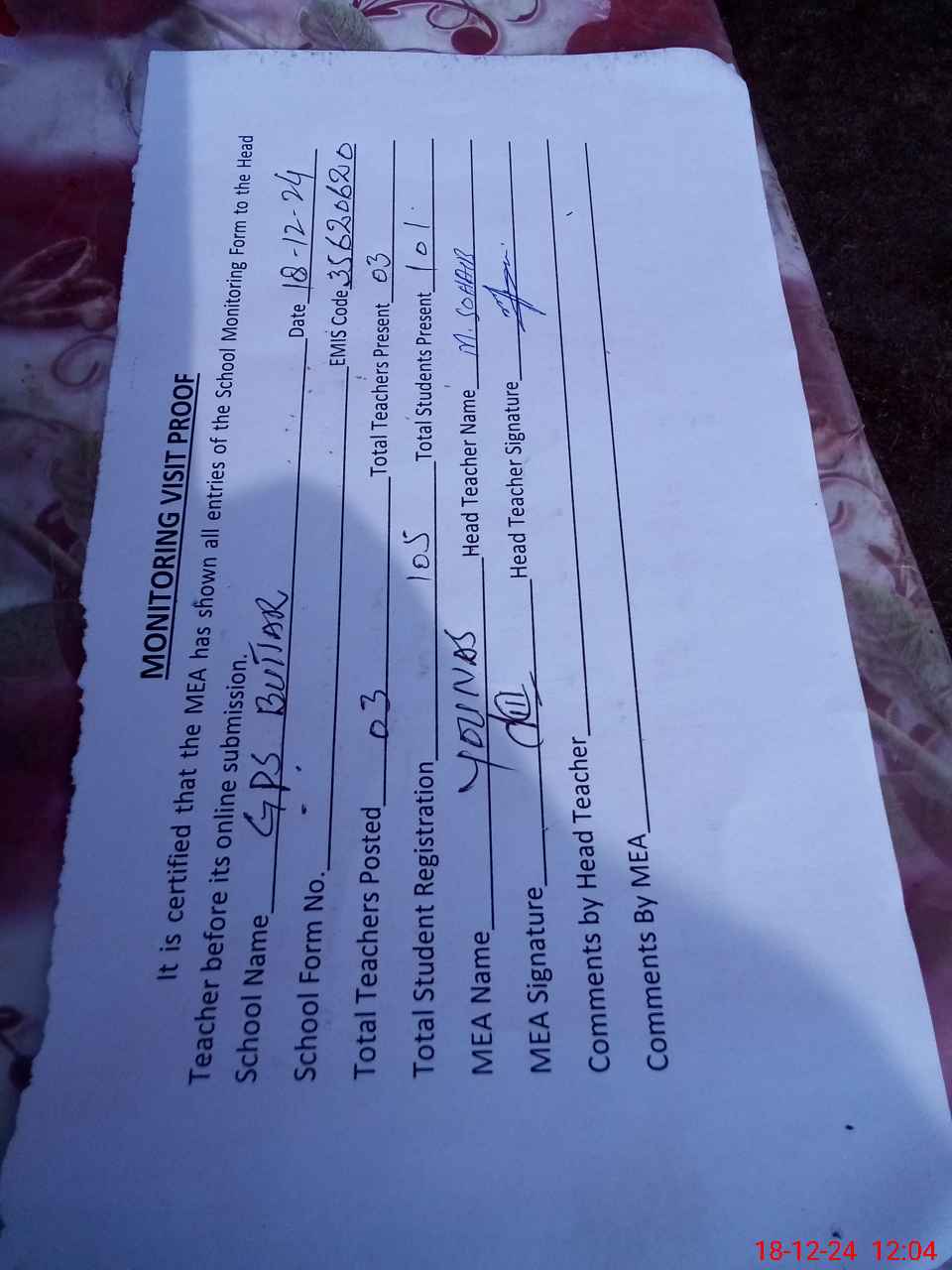 | Attendance Register | Head Teacher | MEA with School | Visit Proof |