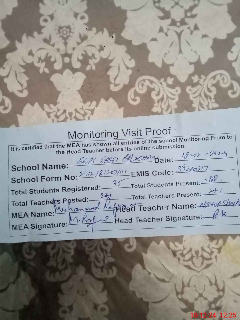 | Certified that this School was Inspected by the Undersigned MEA/DMO Today and the Information Stated Above is as Per Record. | |||||