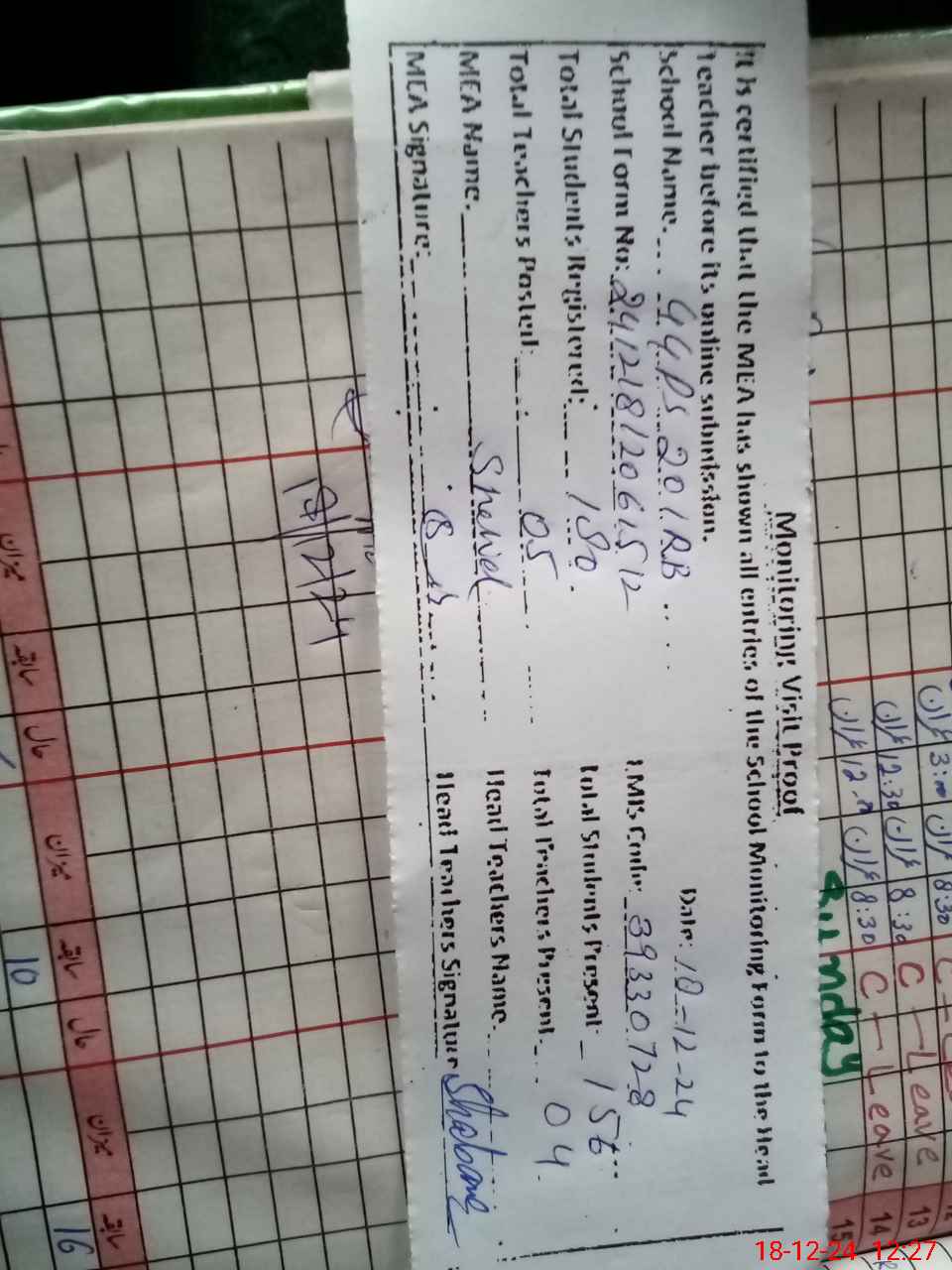 | Attendance Register | Head Teacher | MEA with School | Visit Proof |