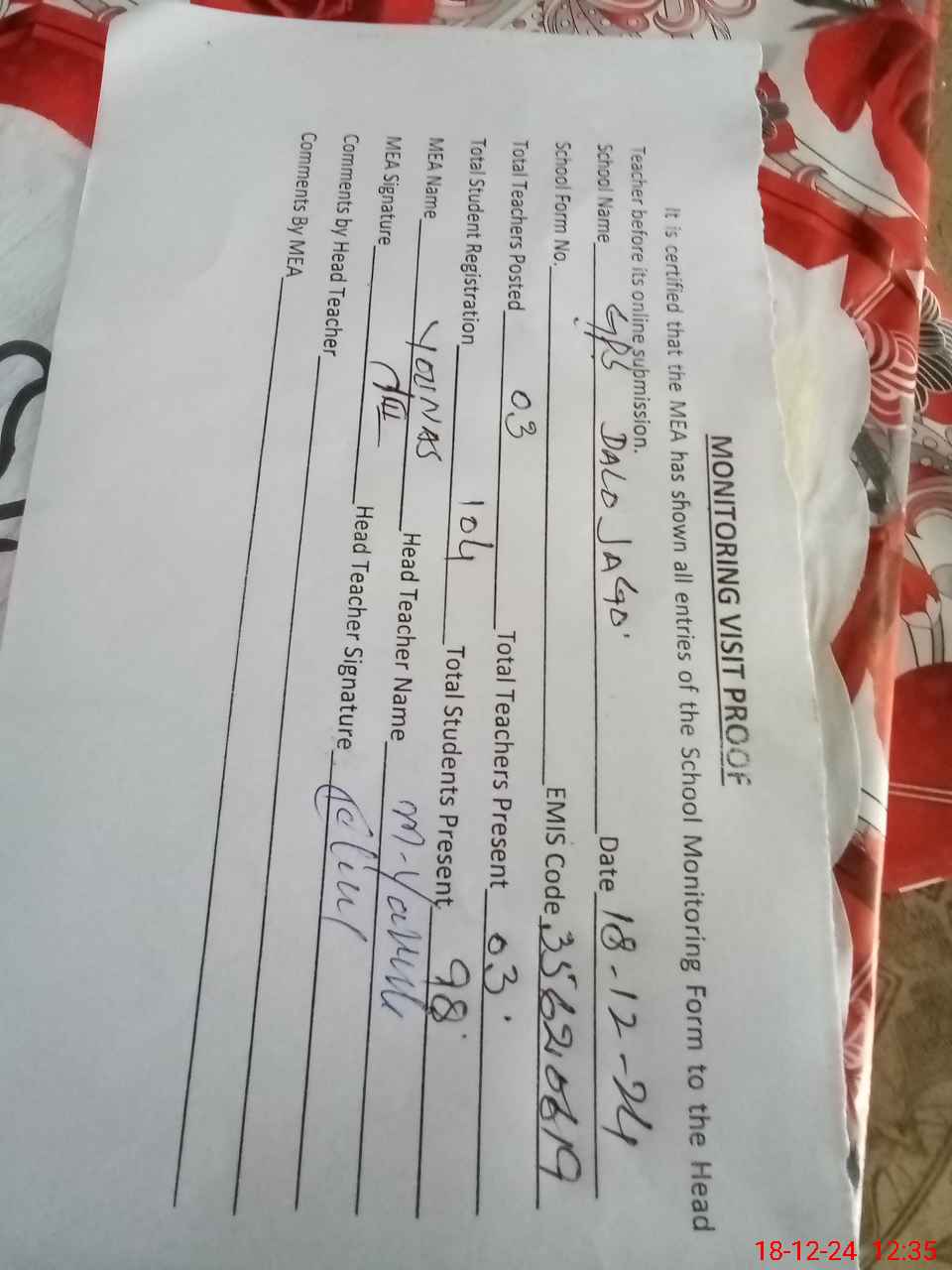 | Attendance Register | Head Teacher | MEA with School | Visit Proof |