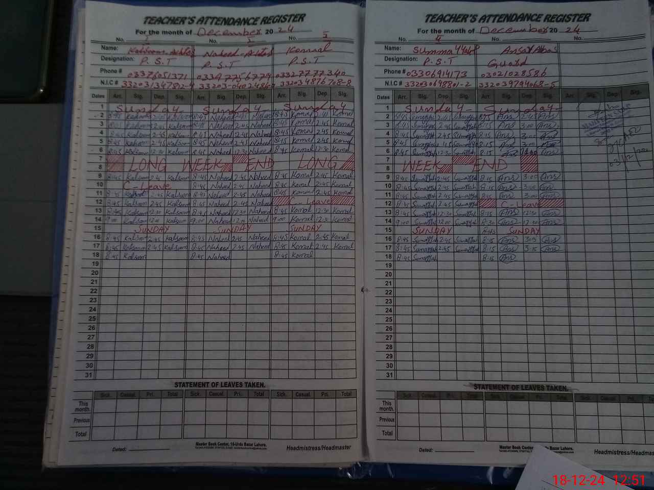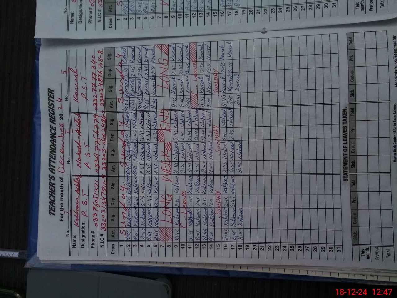 | CNIC | Full Name | Designation | R/C | Absence During Last Calender Month |