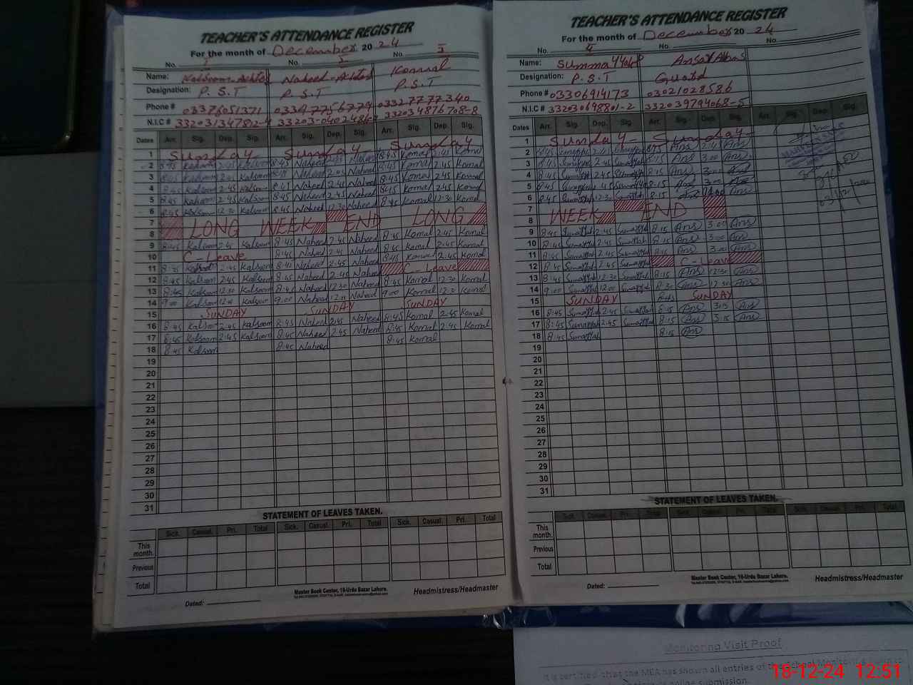 | Attendance Register | Head Teacher | MEA with School | Visit Proof |