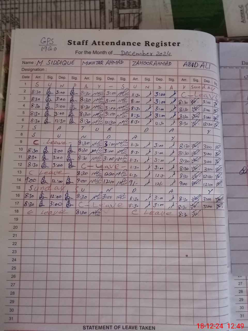 | CNIC | Full Name | Designation | R/C | Absence during last cal. month |