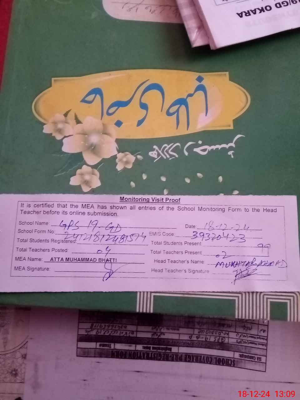 | Attendance Register | Head Teacher | MEA with School | Visit Proof |