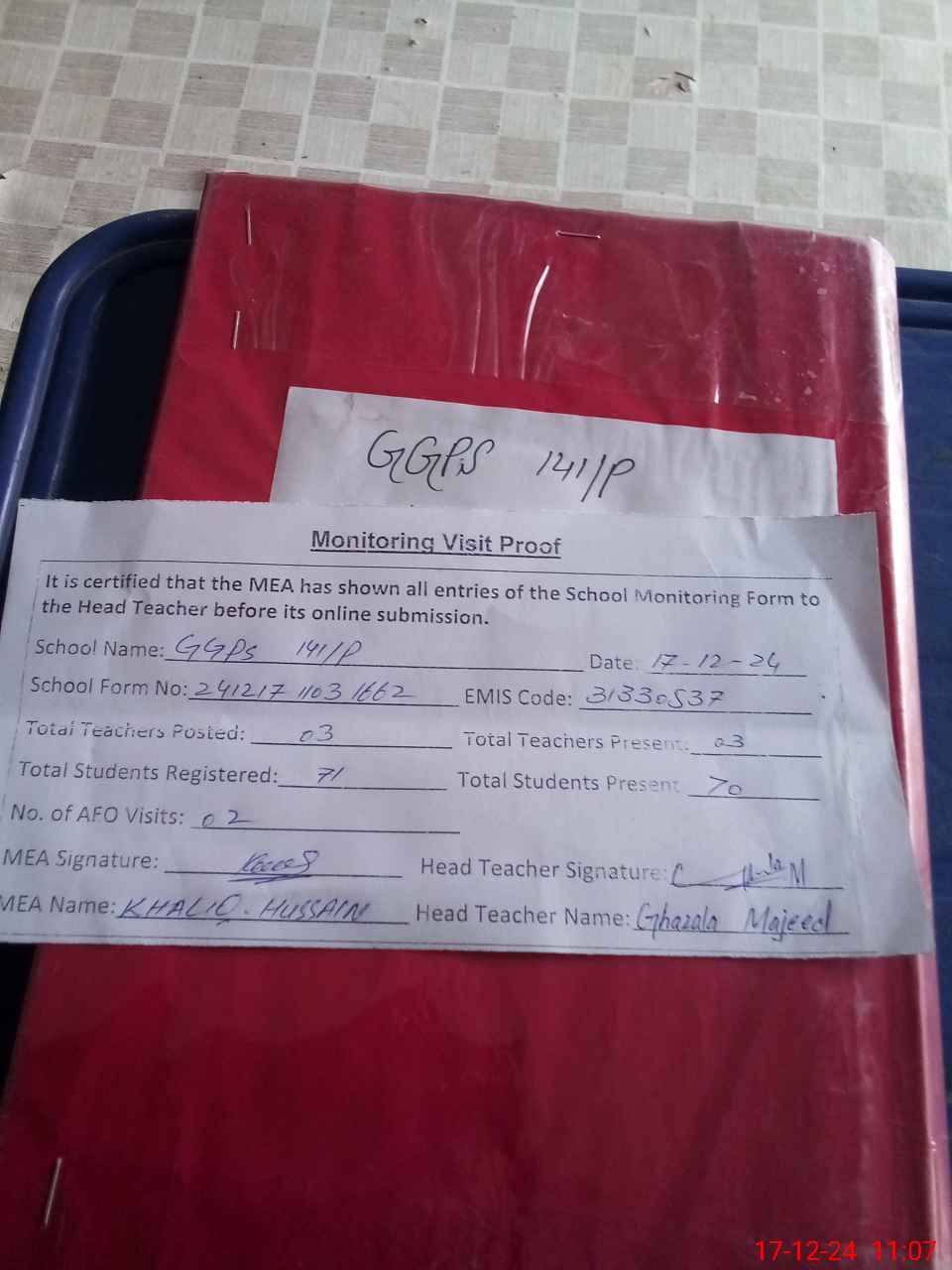 | Attendance Register | Head Teacher | MEA with School | Visit Proof |