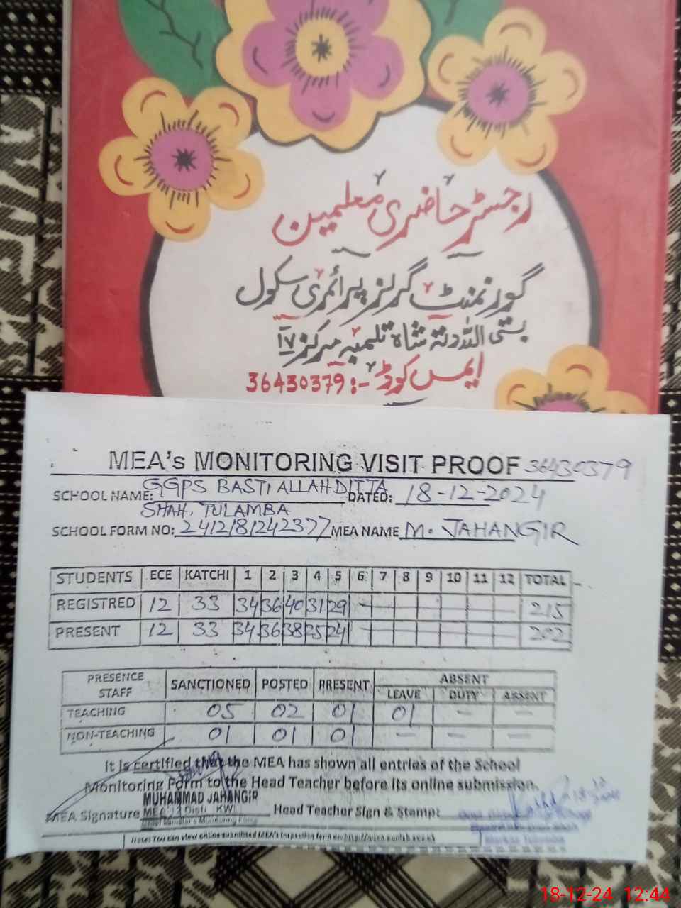 | Attendance Register | Head Teacher | MEA with School | Visit Proof |