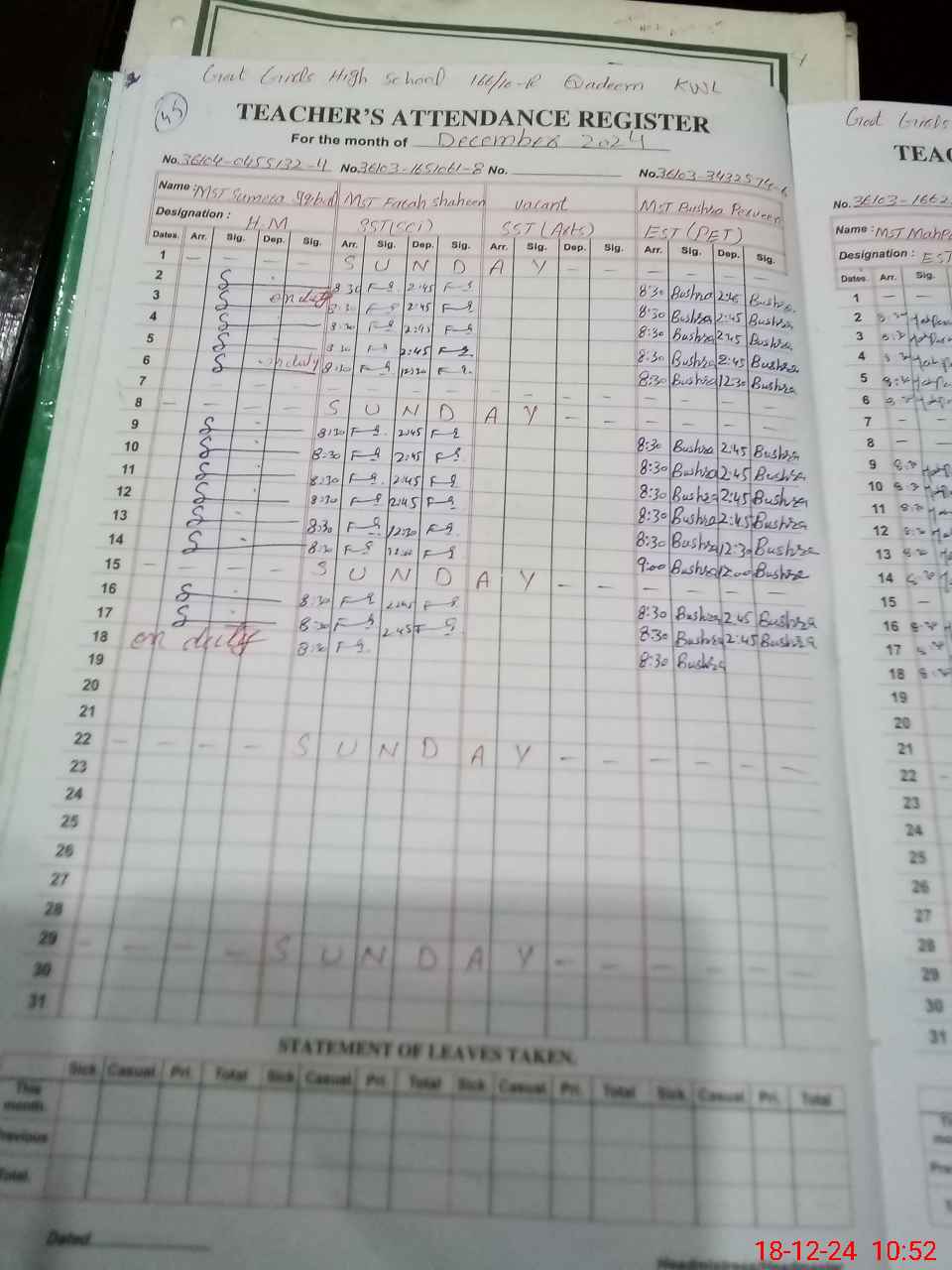 | Leave | Duty | Absent | Maternity | Medical | Ex- Pak |