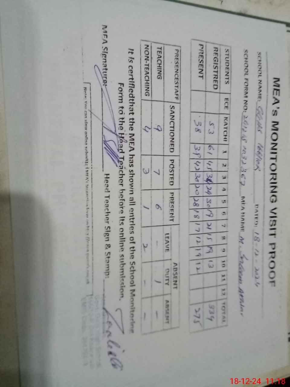 | Attendance Register | Head Teacher | MEA with School | Visit Proof |