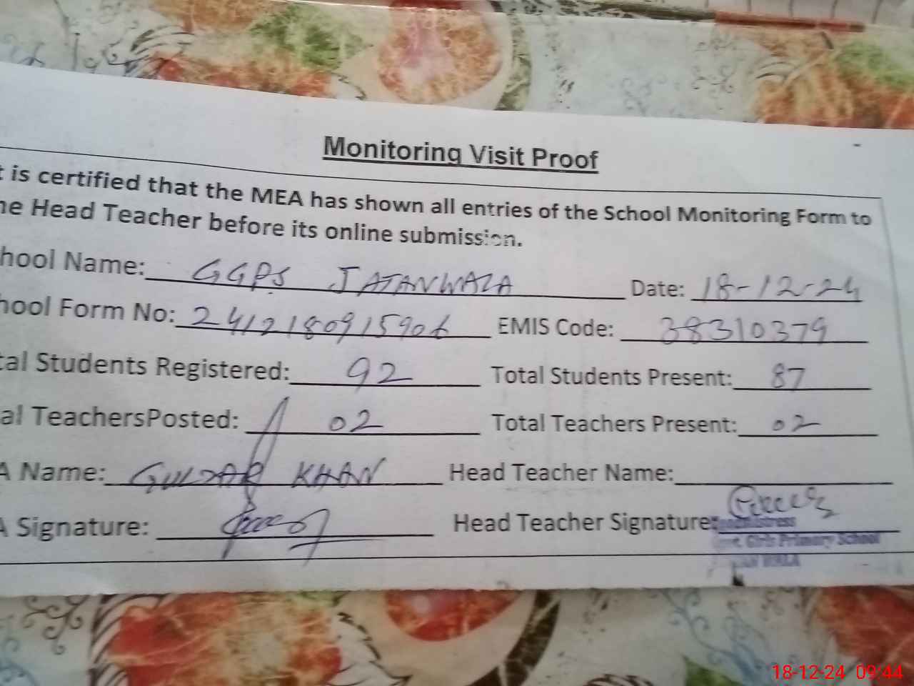 | Attendance Register | Head Teacher | MEA with School | Visit Proof |